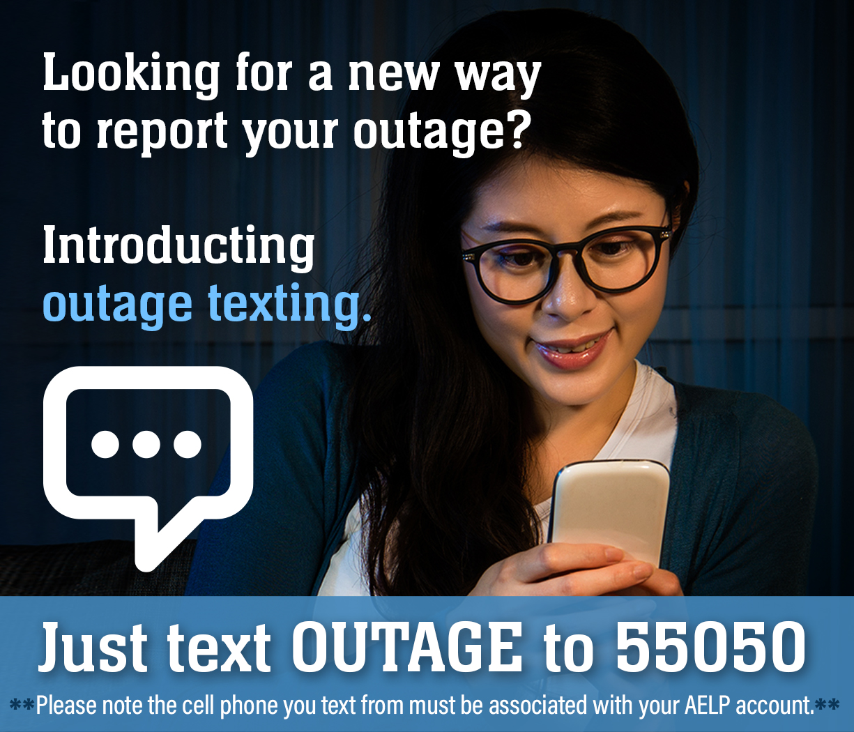 You can now report an outage via text. Simply text the word OUTAGE to 55050 and skip the phone call. Please note that the cell phone you are texting from must be associated with your account. You can log in to aelp.com to check if your number is on the account or call (907.759.5900) or email us (service@aelp.com) and we can check for you.